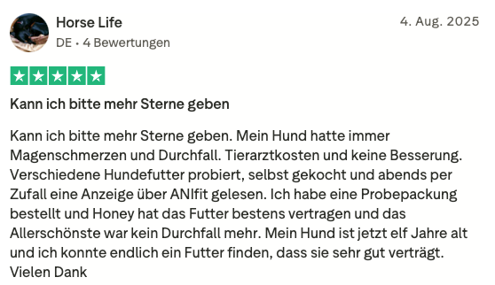 „Fiete war mäkelig & hatte Verdauungsprobleme. Mit Anifit frisst er gerne & alles läuft prima!“